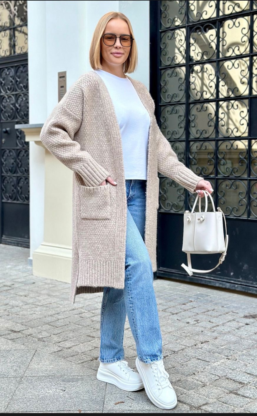 Długi, ozdobnie pleciony kardigan z domieszką wełny to propozycja, której nie może zabraknąć w żadnej garderobie. To niezapinany model z obniżoną linią ramion. Model posiada praktyczne kieszenie.